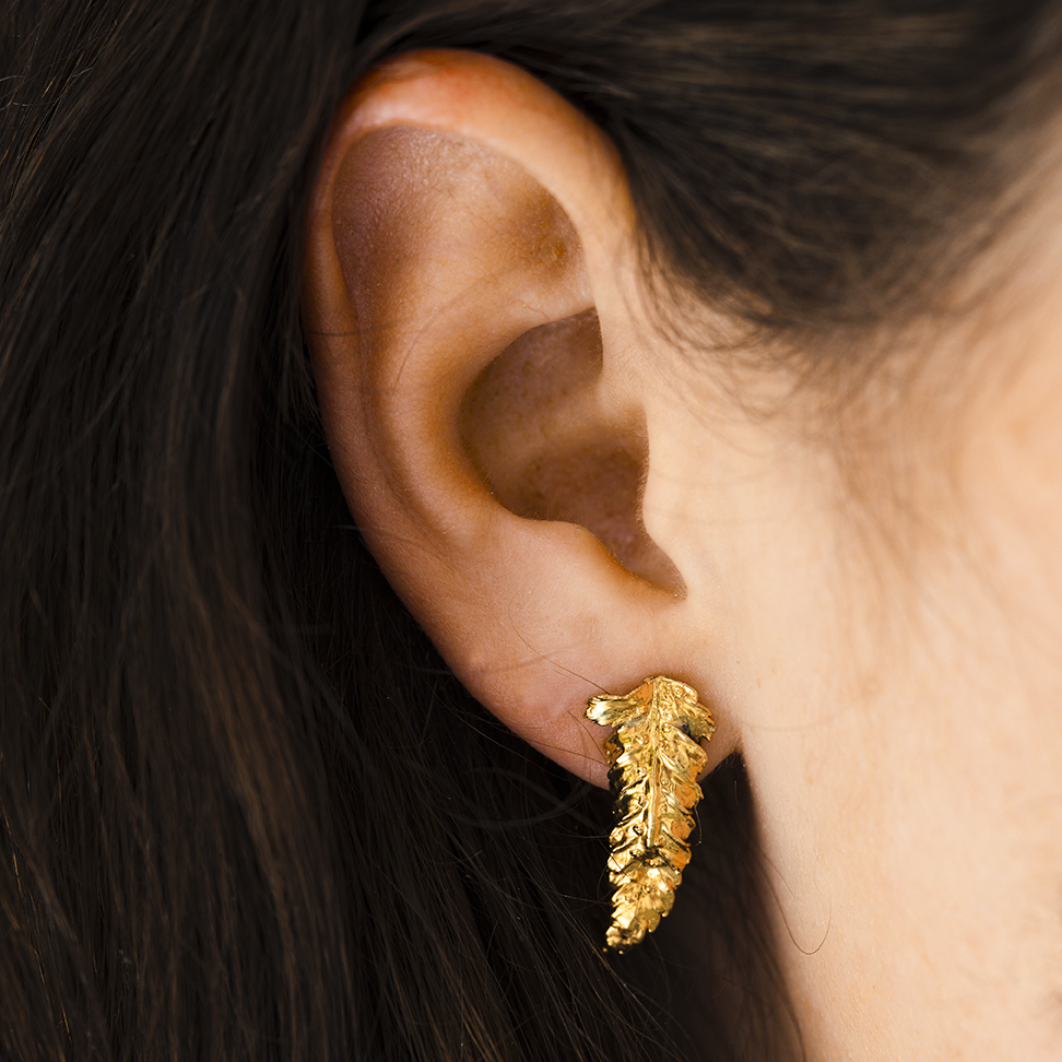 Flora bregne ørestik forgyldt er et unikt evighedssmykke, hvor vi har forgyldt et ægte bregneblad ved elektrolyse! Under den smukke metaloverflade gemmer sig derfor en ægte bregne!