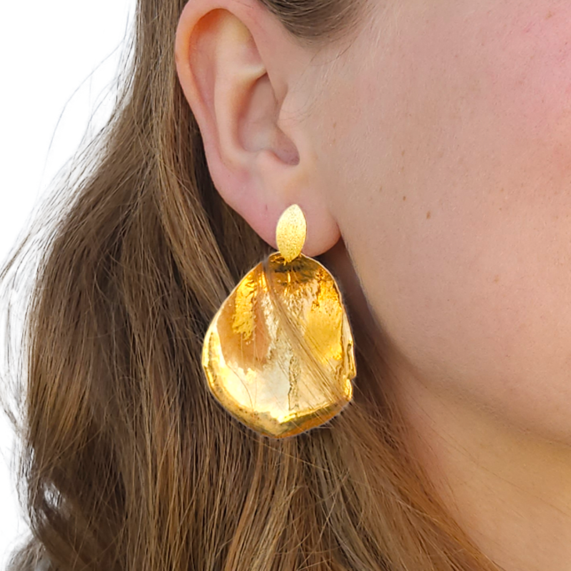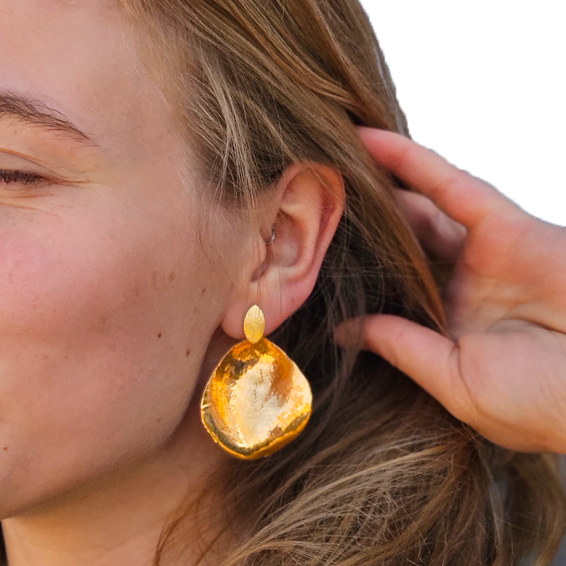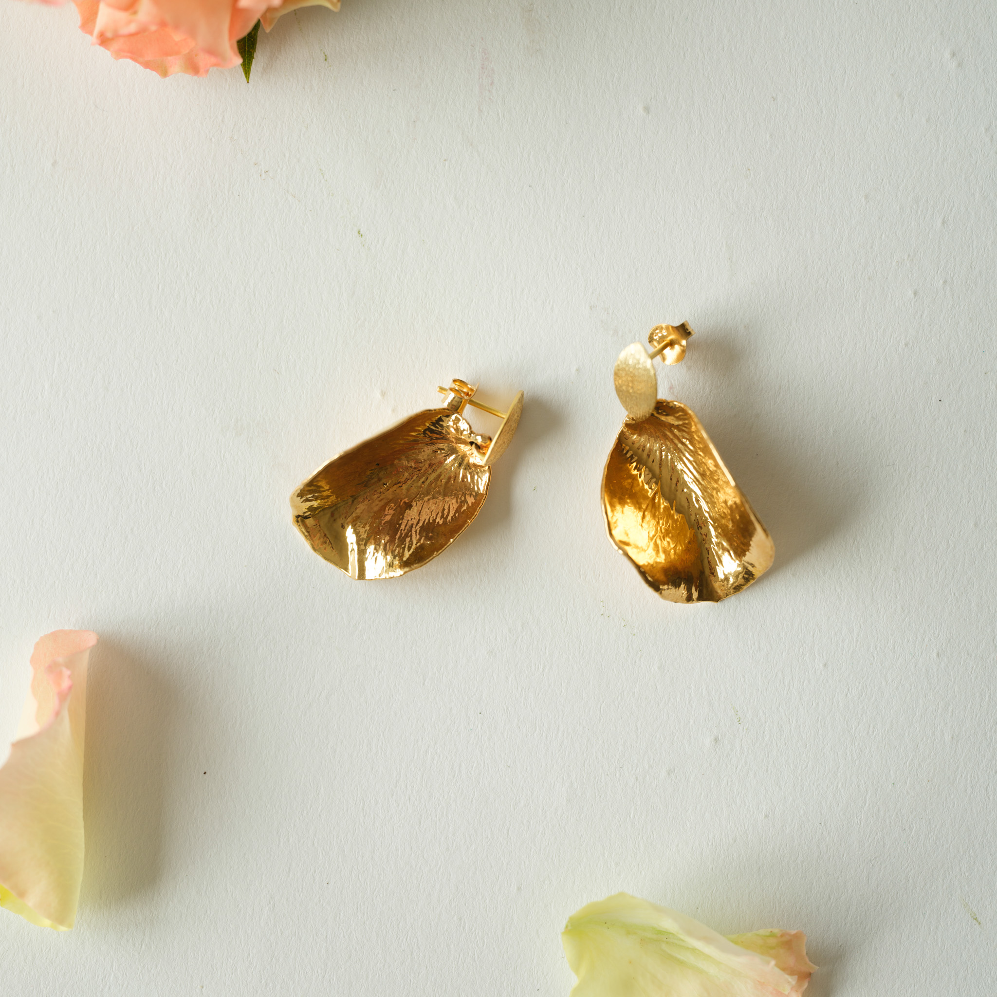 Flora rose ørestikker blad forgyldt er unikke ørestikker, hvor vi har forgyldt et ægte rosekronblad ved hjælp af elektrolyse! Under den smukke metaloverflade gemmer der sig derfor et ægte rosekronblad.